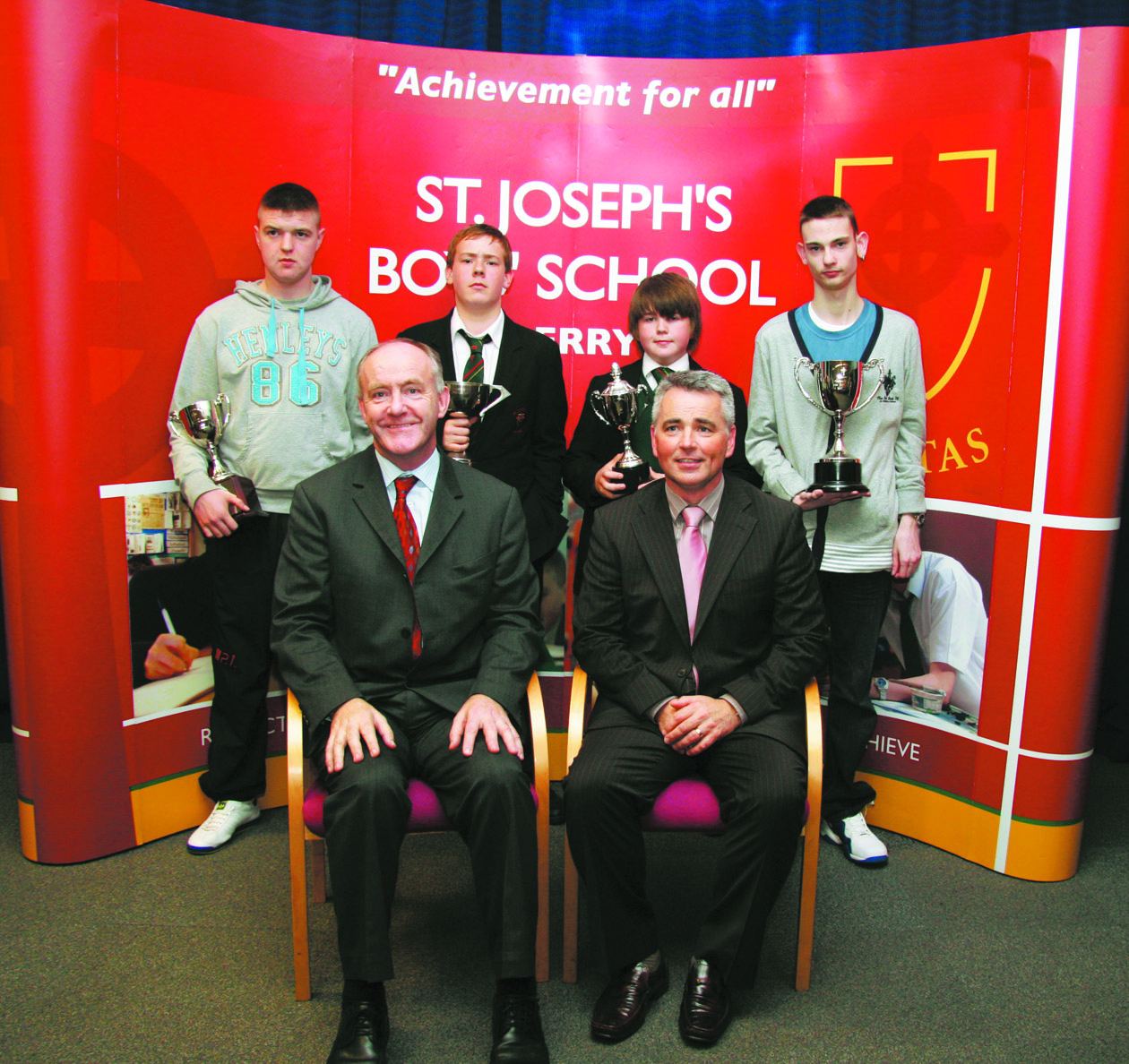 Stephen Harkin (Vocational Award), Feargal Deery (Gaelaras Cup), Ryan Curran (Politics Cup), George McCallion (Step Up Science) with Mr Harkin and Mr P Durkan