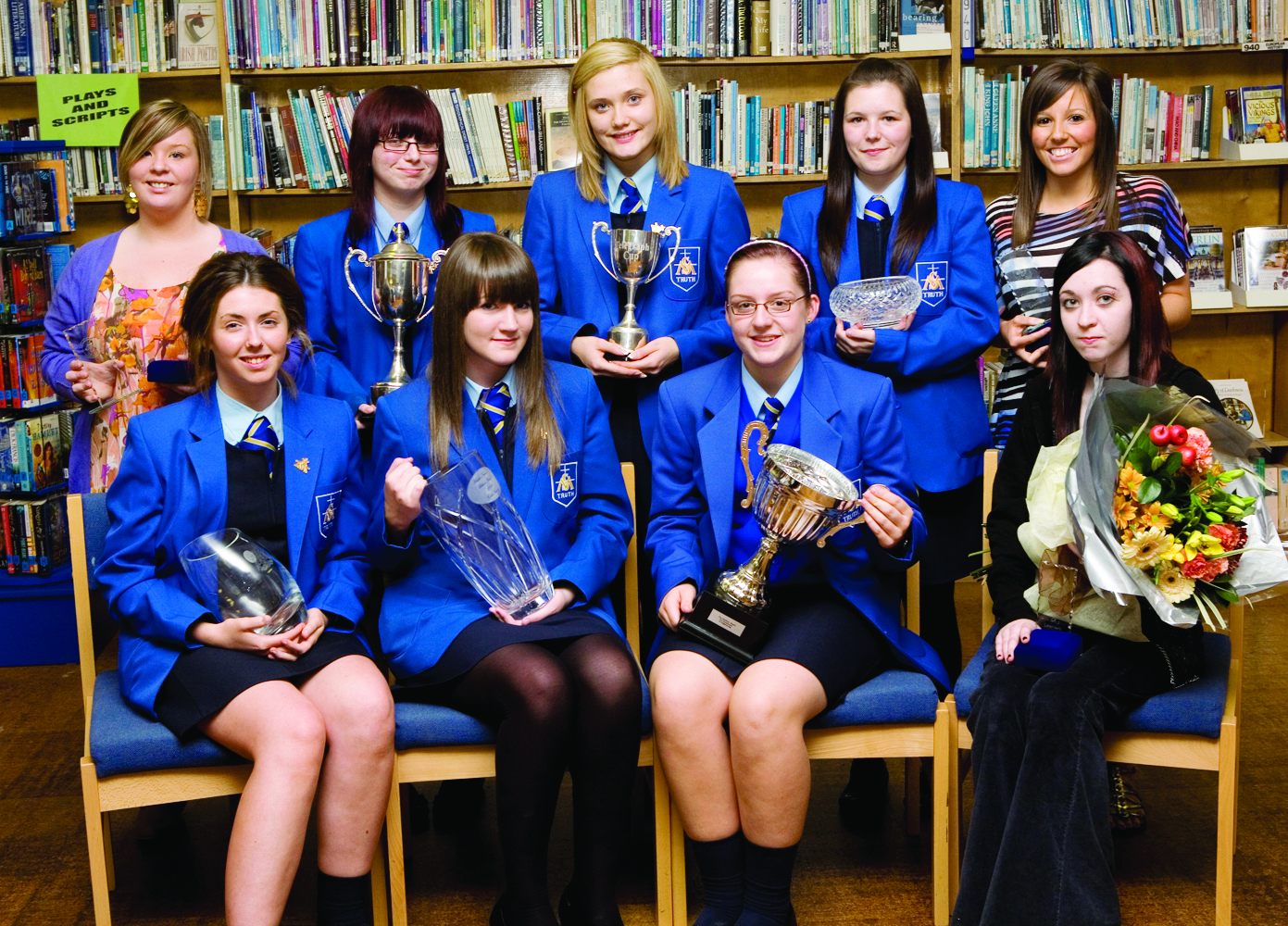 Seated, from left, are Rachel Curran (leisure and tourism trophy), Clare McCallion (health & social care), Toni Miller (Sentinus award for excellence in engineering) and Helen McConnel (music). Standing, from left, are Stacey Duddy (history), Stacey Thompson (Maureen Hunt Cup for music), Morgyn McLaren (Belfast Telegraph trophy for LLW), Stacey Friel (parent/teacher association award for drama), and Kayleigh Cassidy (applied ICT).