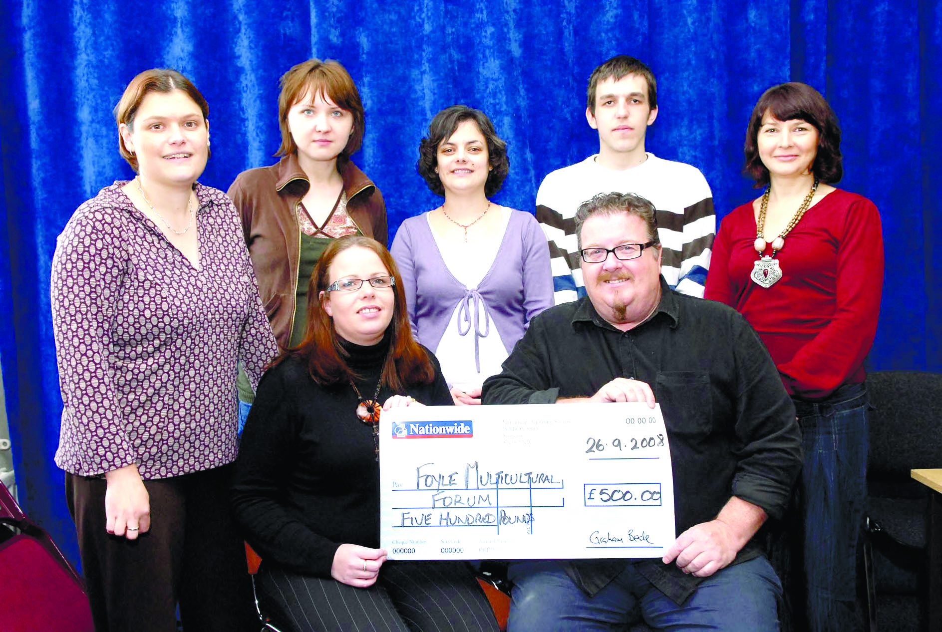 Katrina Kordula, seated, Director of the NI Polish Welfare Association and member of the Foyle Multi-Cultural Forum, who was the Northern Ireland regional winner at the Nationwide and Community Heritage Awards, pictured with her £500.00 prize. Included are, Eddie Kerr, seated, Foyle Multi-Cultural Forum member, and from left, Sue Divin, Community Relations Officer, Derry City Council, Marlena Musialek, Roisin O'Hagan, INCORE, Maciej Majek and Laura Giacani.