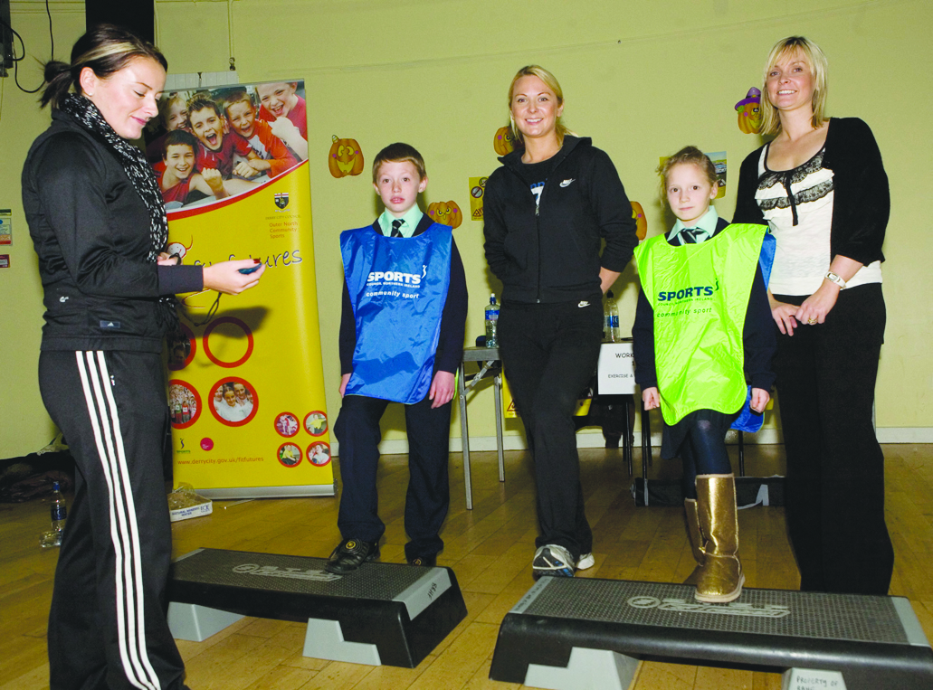 Pupils, Chrisopher McLaughlin and Aishling Parke taking part in step for fitness at the Gasyard Centre. Included are Diana Hutton, Health Forum, Teresa Brdley, Fit Futures, and Carol Radcliff, co-ordinator, Fit Wanes Project,