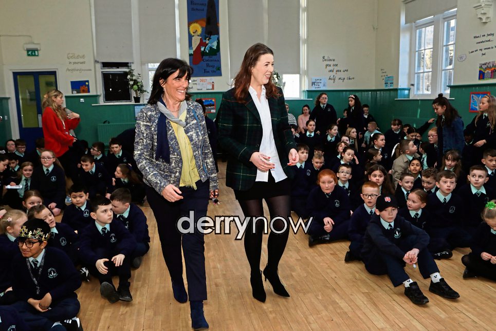 'Derry Girls' creator Lisa McGee with school principal, Mrs. Joyce Logue, arriving in the school's assembly hall (formerly the Wee Nuns girls primary school) during a visit to Longtower PS, last Friday. (Photos - Tom Heaney, nwpresspics)