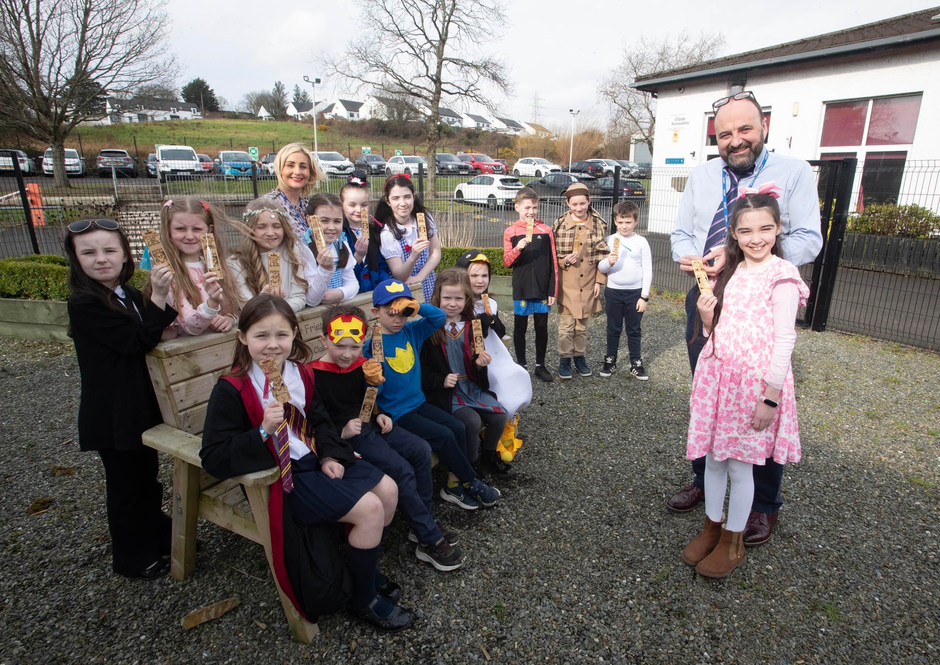 WELL DONE ACCELERATED READERS!. . . . . Mr. Feargal Friel, Principal, Hollybush PS pictured handing over a book marker to Katie Lynch who recently achieved her 2,000,000 word count target on Thursday during World Book Day celebrations. Included are other children who achieved similar awards, and at back, Mrs. Houston, teacher. (Photos: Jim McCafferty Photography)