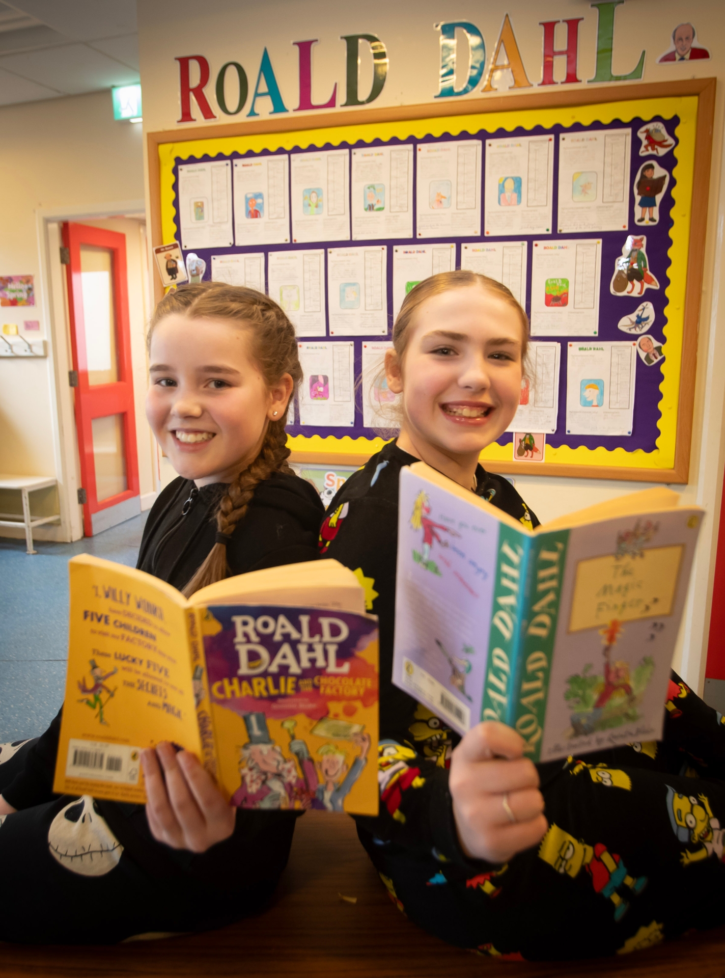 Roald Dahl fans Annie Gallagher and Abbie Buchanan celebrate World Book Day at Hollybush PS on Thursday with their favourite author Roald Dahl. (Photos: Jim McCafferty Photography)