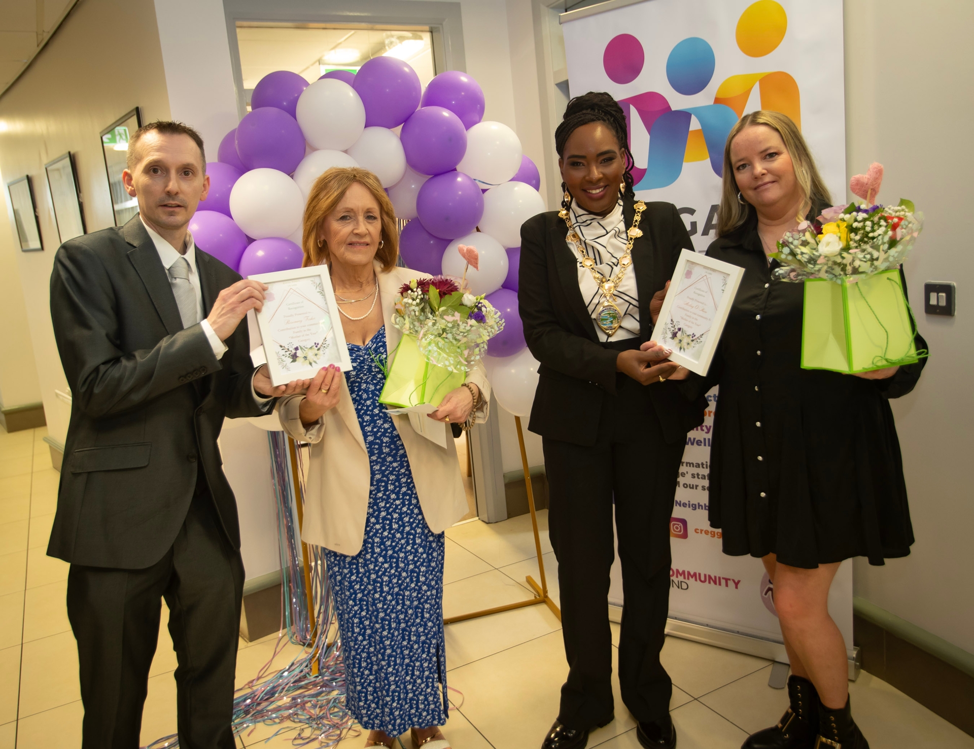 Mother of Year award winners Rosemary Fisher and Aisling O'Hara receiving their 'Rising Women' awards from Barry McCabe, Community Development Engage Project Officer and the Mayor, Lilian Seenoi-Barr at Saturday's event.