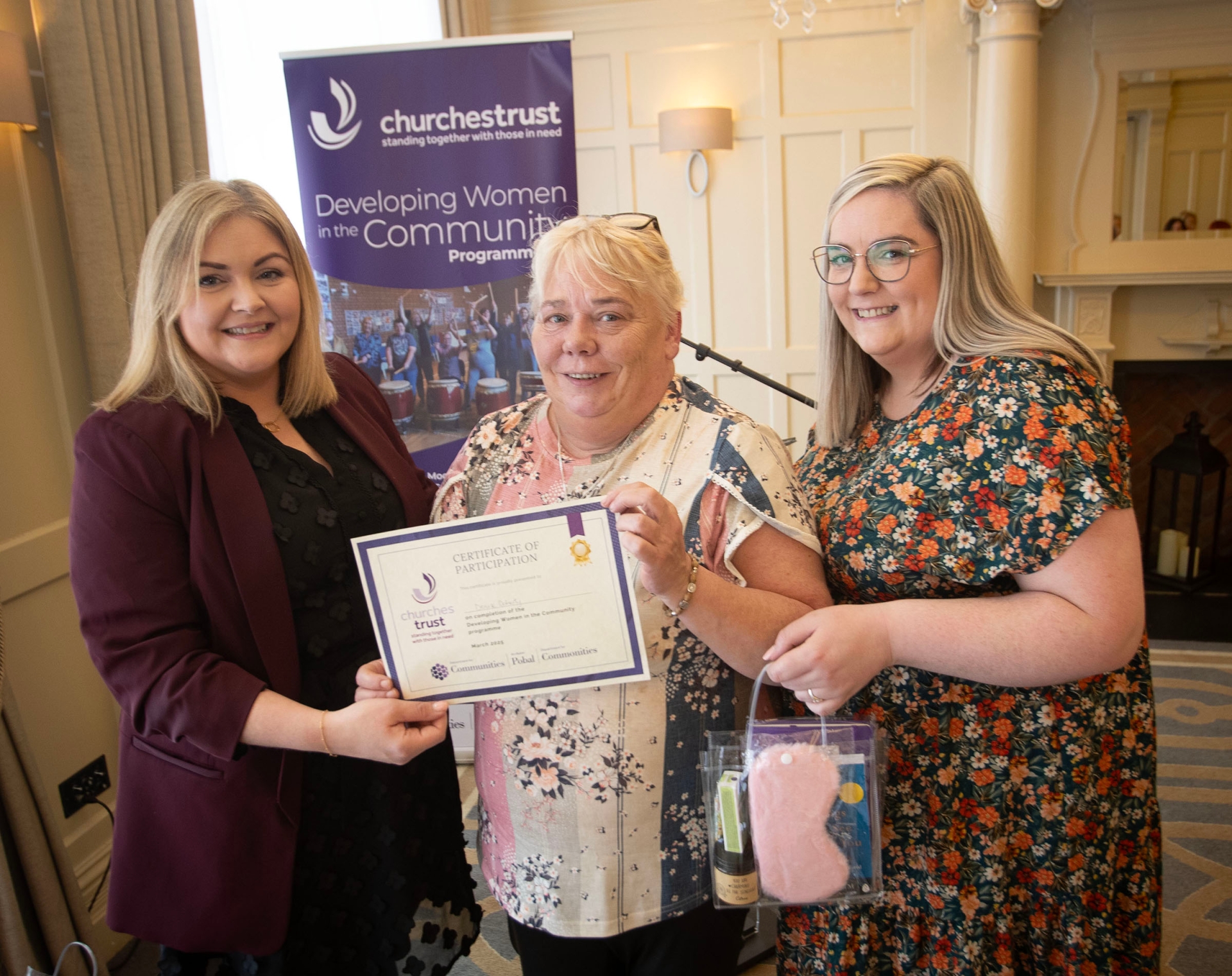 Denise Doherty (centre) receiving her Churches Trust 'Developing Women in the Community' programme certificate from Laura Brown, Community Relations Manager (left) and Margaret Bonner, Health Equalities Co-Ordinator, Churches Trust, at Thursday's awards in the Bishop's Gate Hotel, Derry.