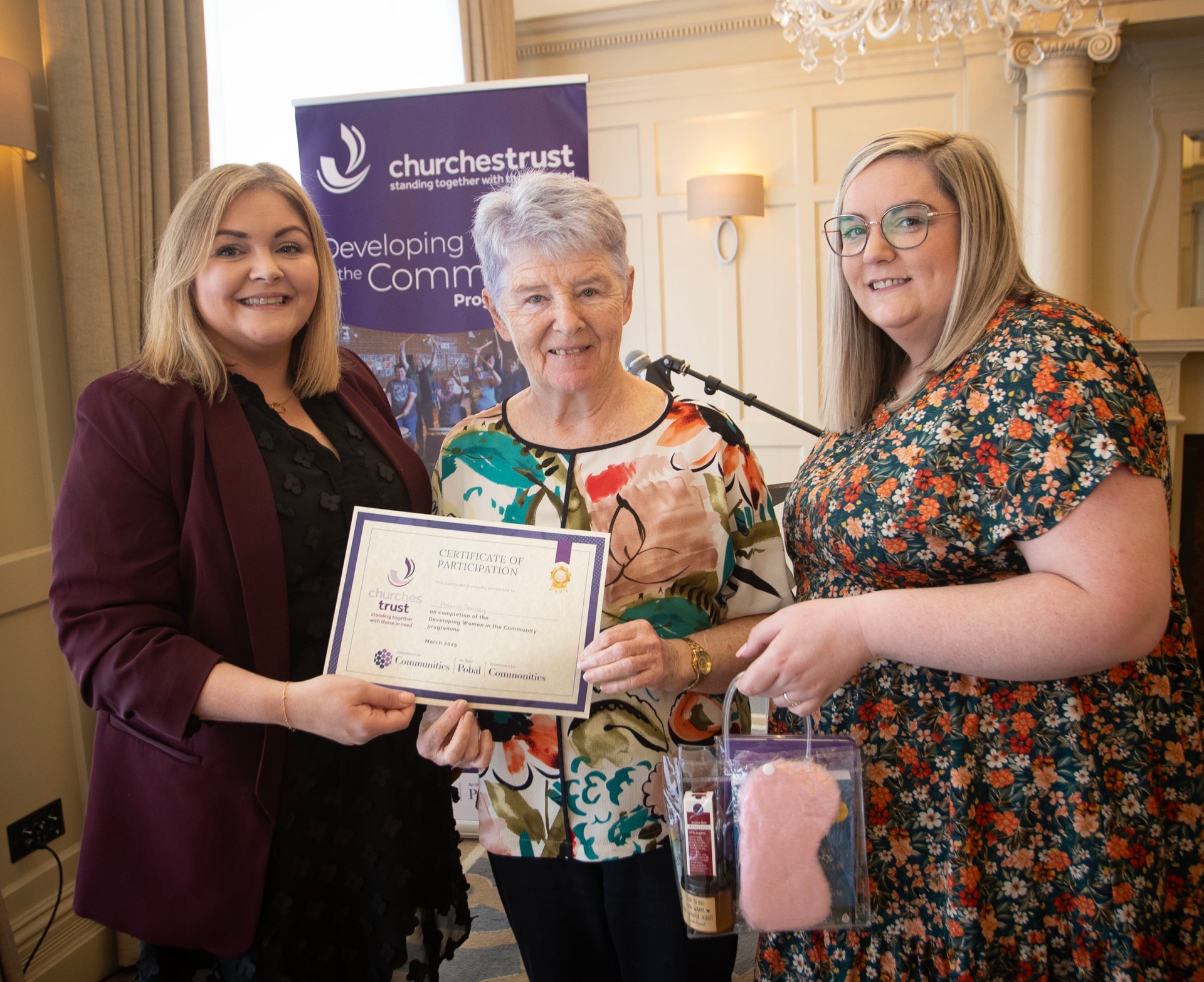 Helena Downey (centre) receiving her Churches Trust 'Developing Women in the Community' programme certificate from Laura Brown, Community Relations Manager (left) and Margaret Bonner, Health Equalities Co-Ordinator, Churches Trust, at Thursday's awards in the Bishop's Gate Hotel, Derry.