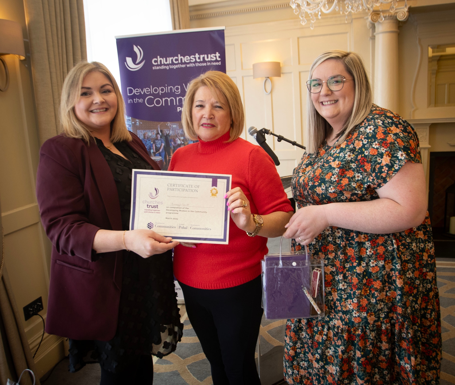 Bronagh Elliott (centre) receiving her Churches Trust 'Developing Women in the Community' programme certificate from Laura Brown, Community Relations Manager (left) and Margaret Bonner, Health Equalities Co-Ordinator, Churches Trust, at Thursday's awards in the Bishop's Gate Hotel, Derry.
