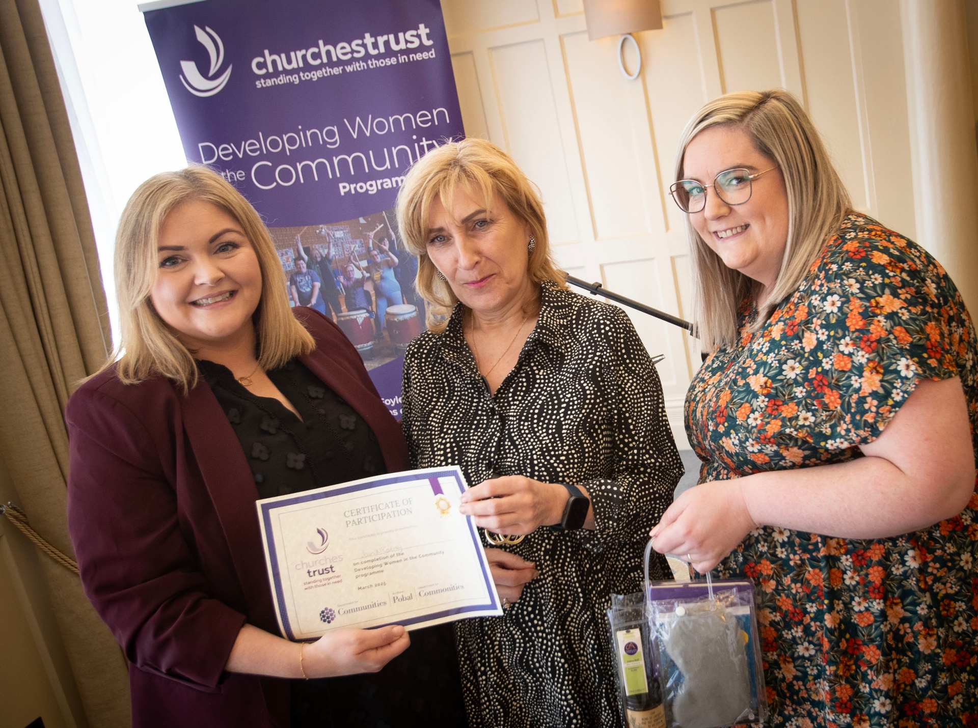 Joan McCartney (centre) receiving her Churches Trust 'Developing Women in the Community' programme certificate from Laura Brown, Community Relations Manager (left) and Margaret Bonner, Health Equalities Co-Ordinator, Churches Trust, at Thursday's awards in the Bishop's Gate Hotel, Derry.