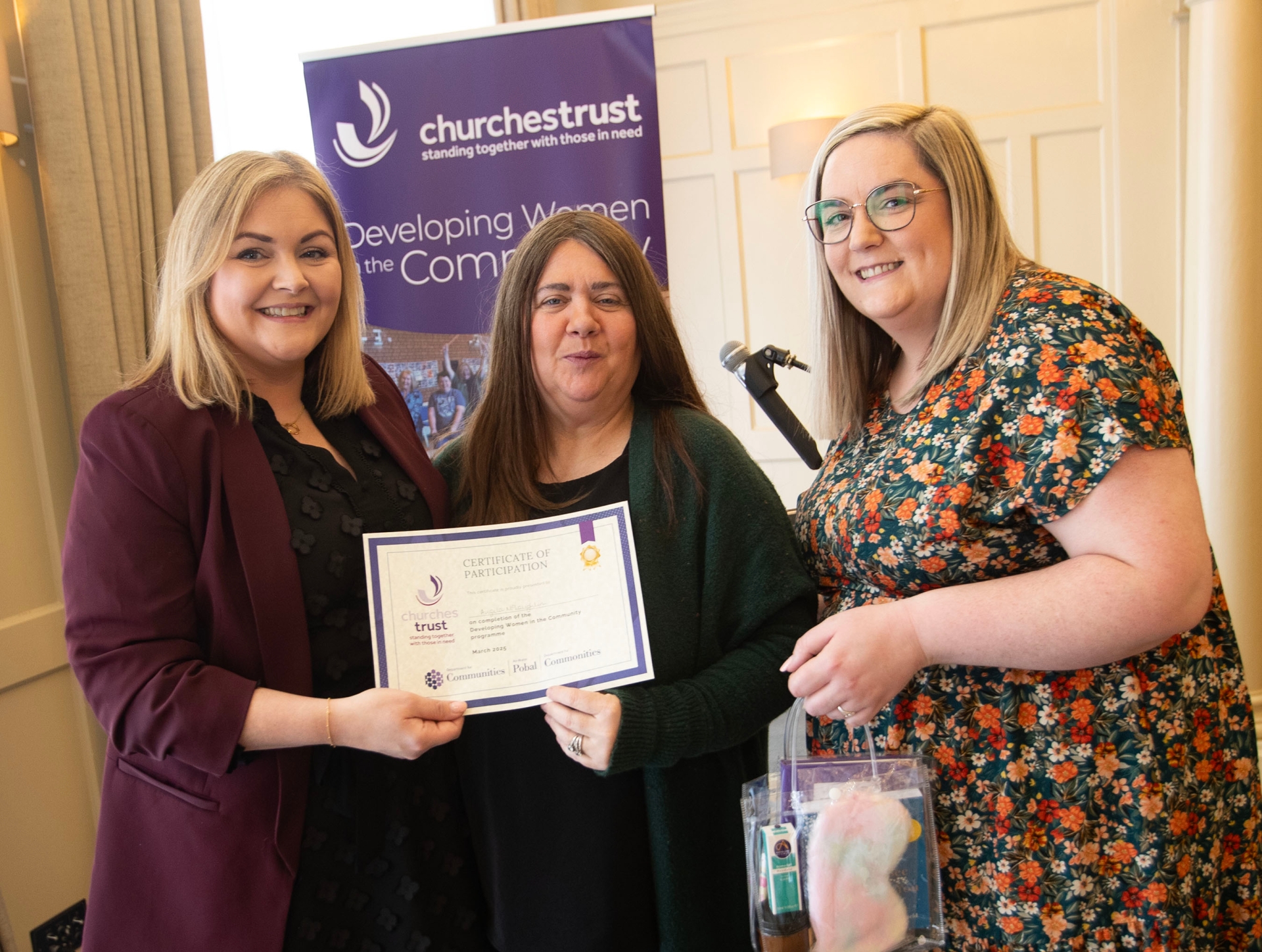 Angela McLaughlin (centre) receiving her Churches Trust 'Developing Women in the Community' programme certificate from Laura Brown, Community Relations Manager (left) and Margaret Bonner, Health Equalities Co-Ordinator, Churches Trust, at Thursday's awards in the Bishop's Gate Hotel, Derry. (Photos: Jim McCafferty Photography)