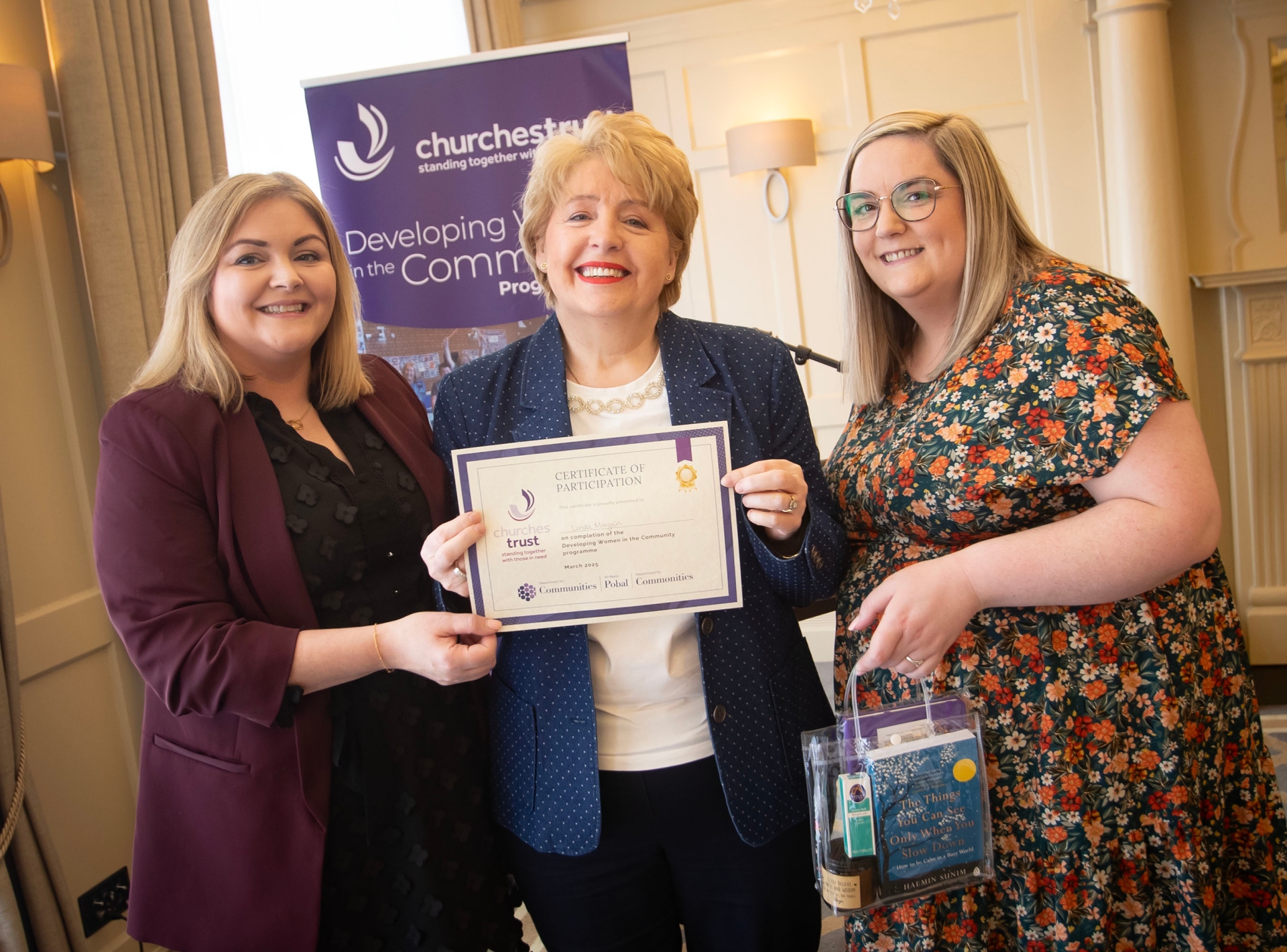 Linda Morgan (centre) receiving her Churches Trust 'Developing Women in the Community' programme certificate from Laura Brown, Community Relations Manager (left) and Margaret Bonner, Health Equalities Co-Ordinator, Churches Trust, at Thursday's awards in the Bishop's Gate Hotel, Derry.