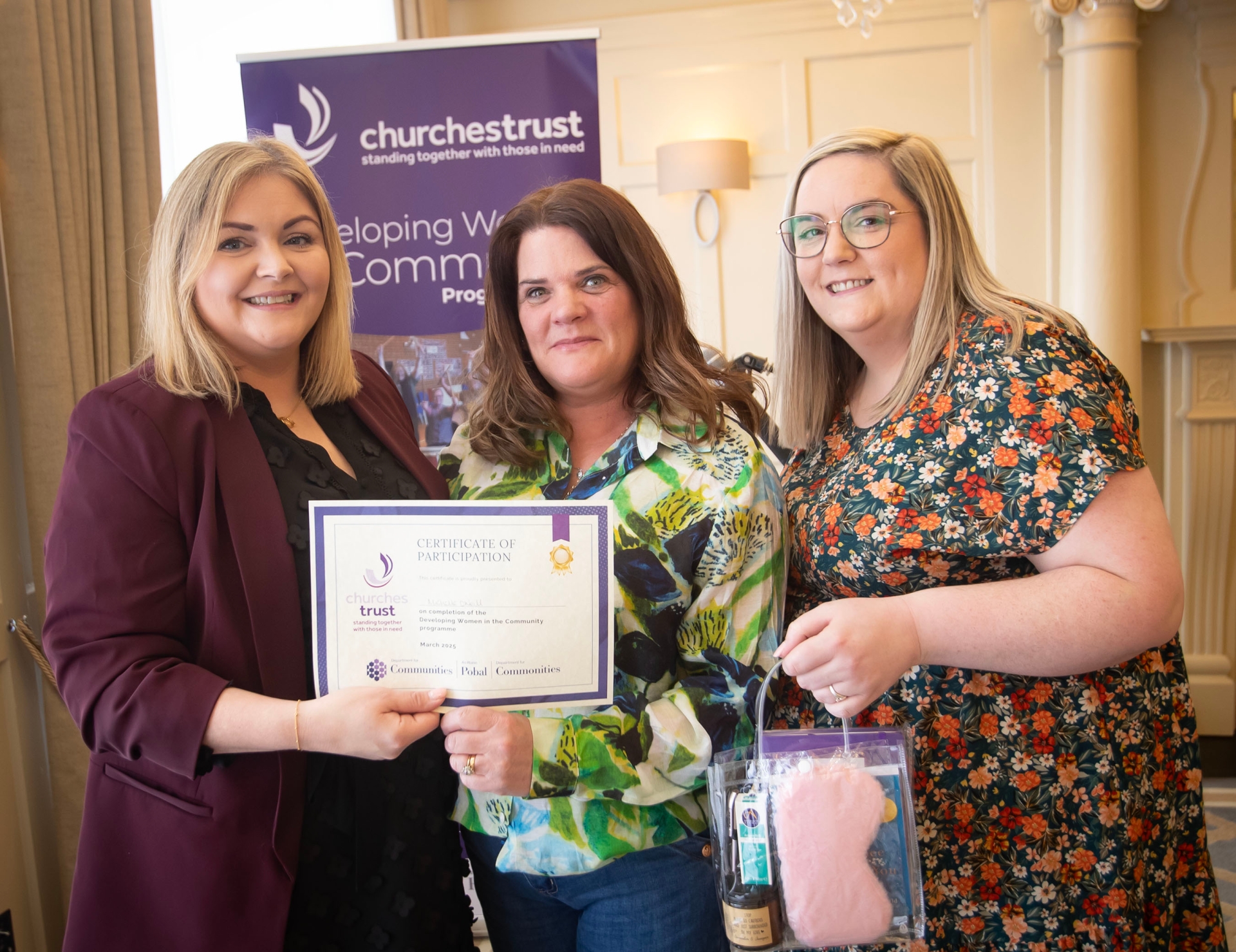 Michelle O'Neill (centre) receiving her Churches Trust 'Developing Women in the Community' programme certificate from Laura Brown, Community Relations Manager (left) and Margaret Bonner, Health Equalities Co-Ordinator, Churches Trust, at Thursday's awards in the Bishop's Gate Hotel, Derry.