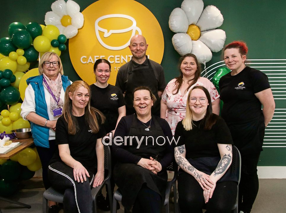 Café Central staff celebrate their 1st birthday. Standing from left, are, Irene Wilson, Clodagh Barry, John McLaughlin, Karen McLaughlin and Mary Kelly. Seated from left, Annette Keeling, Ciara Doherty and Victoria McAleese. (Photos - Deirdre Heaney, nwpresspics)