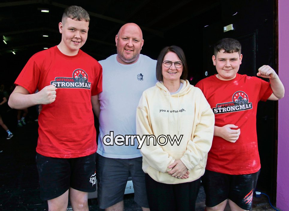 Matthew McClelland, aged 13 and his brother Harry, aged 12 who took part in The OSG Record Breakers and World Log and Deadlift Championships held at Savage Strength Gym. Included are their parents Alaster and Charlotte. (Photos - Deirdre Heaney, nwpresspics)