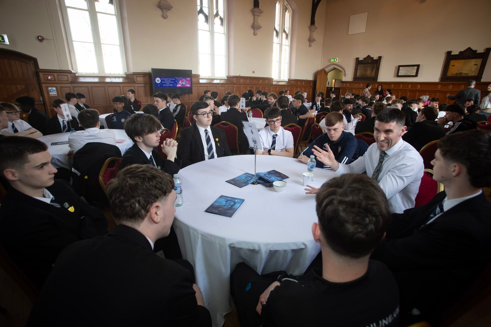 Former St. Columb's College student and local Hollybush PS Vice Principal, Mr. Cahir O'Connor at Friday's Round Table Careers Event, chatting to Year 13 students.