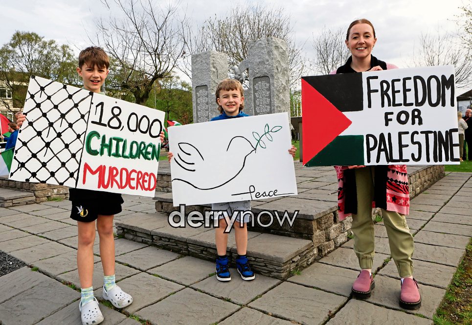 Councillor Grace Uí Niallais with her children at the Tar Abhaile vigil to mark Palestinian Prisioners' Day and to oppose the ongoing Israeli genocide on Gaza, on Thursday night. (Photos - Tom Heaney, nwpresspics)