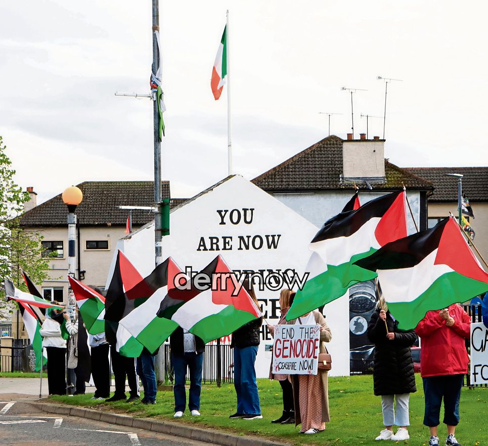 Tar Abhaile, former Republican prisioners, gather at the Hunger Strike Monument, Free Derry Corner, for a vigil to mark Palestinian Prisioners' Day and oppose the ongoing Israeli genocide on Gaza.