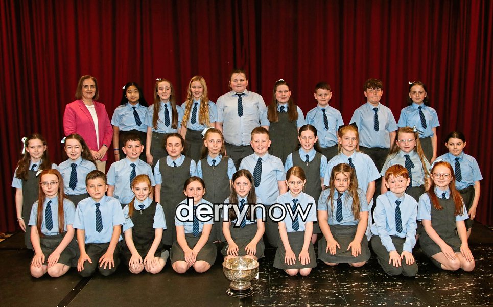 St. Anne's PS pupils, winners of the Derry Journal Cup for Senior Action Song, Under 12. Included is Nicola Soal, music teacher.