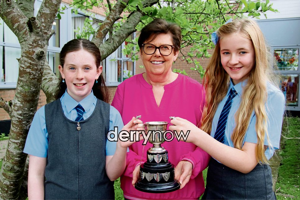 St. Anne's PS P7 pupils, Meena and Nia winners of the Primary School History Project. Included is Katrina Martin, Co-ordinator.
