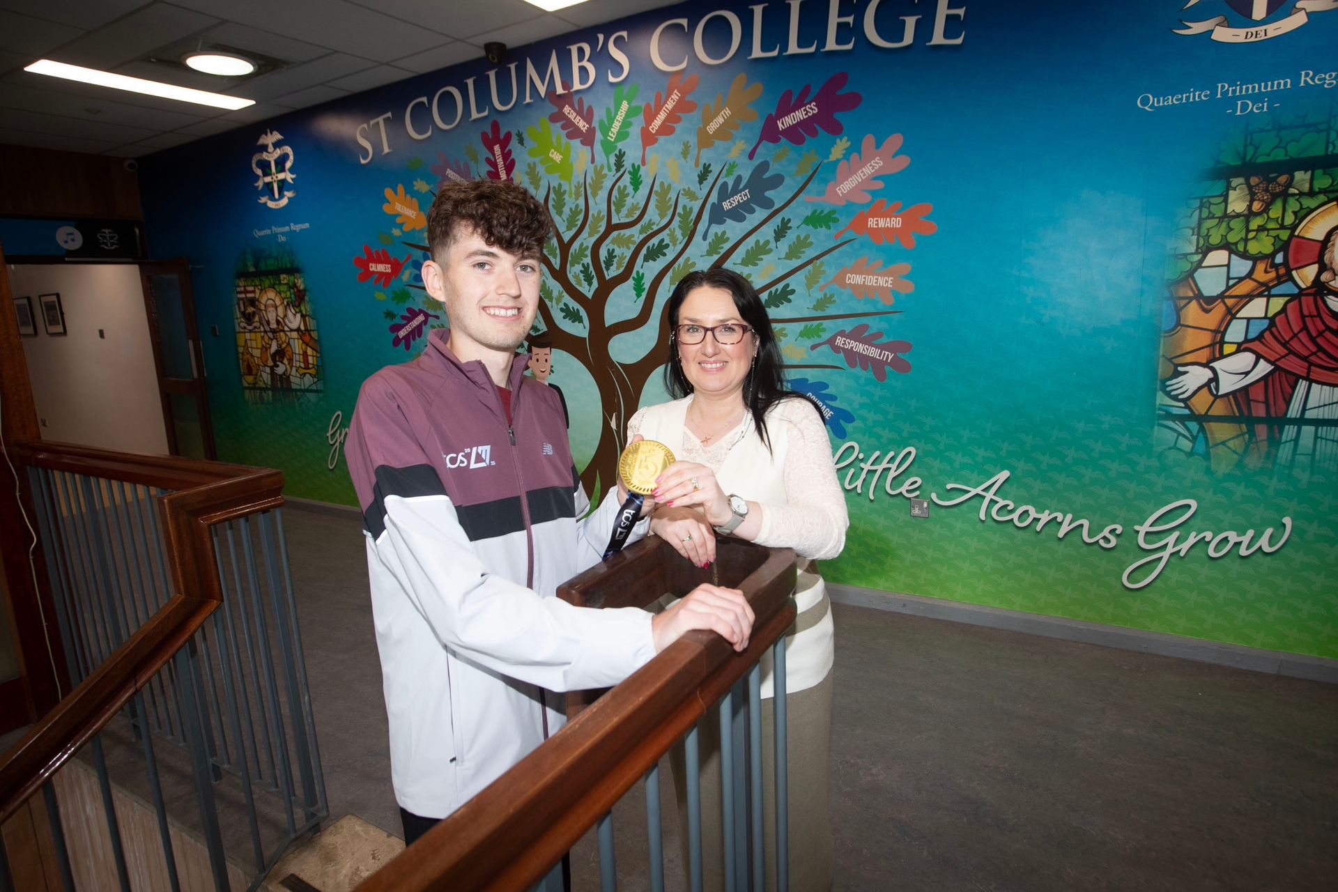 CONGRATULATIONS!. . . . 'Great Oaks From Little Acorns Grow' - Mrs. Caroline McLaughlin, Principal, St. Columb's College congratulating Dan at the school on Monday. (Photos: Jim McCafferty Photography)