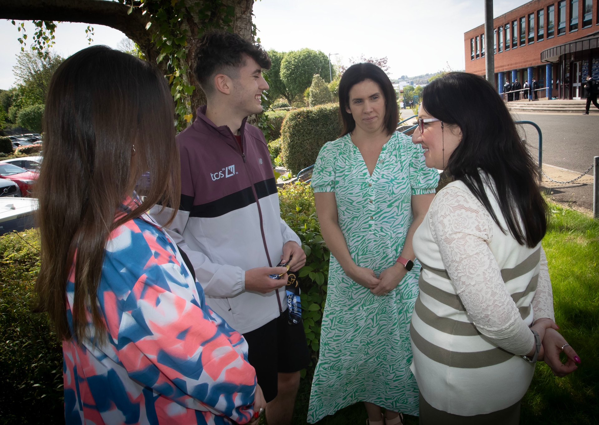 Sam Brattin pictued with his girlfriend Meabh O'Sullivan, chat with Mrs. Caroline McLaughlin, Principal during last week's visit to St. Columb's.