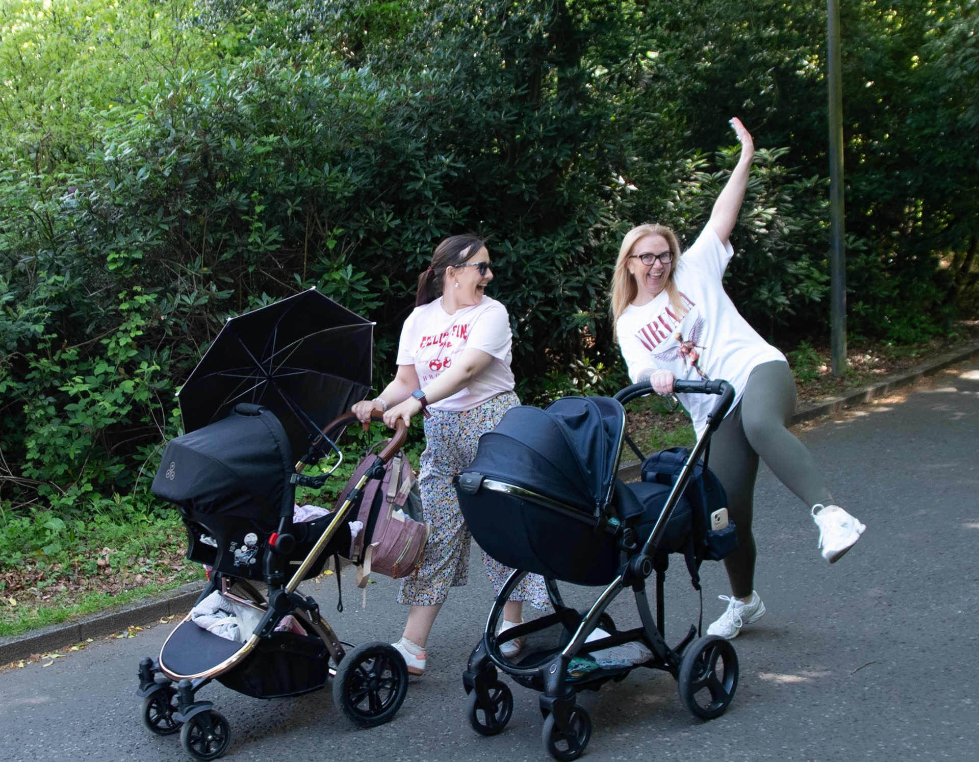 Mums Jenny Beveridge and Cathy Burke enjoying the One Big Walk in the Park for World Maternal Mental Health Day.