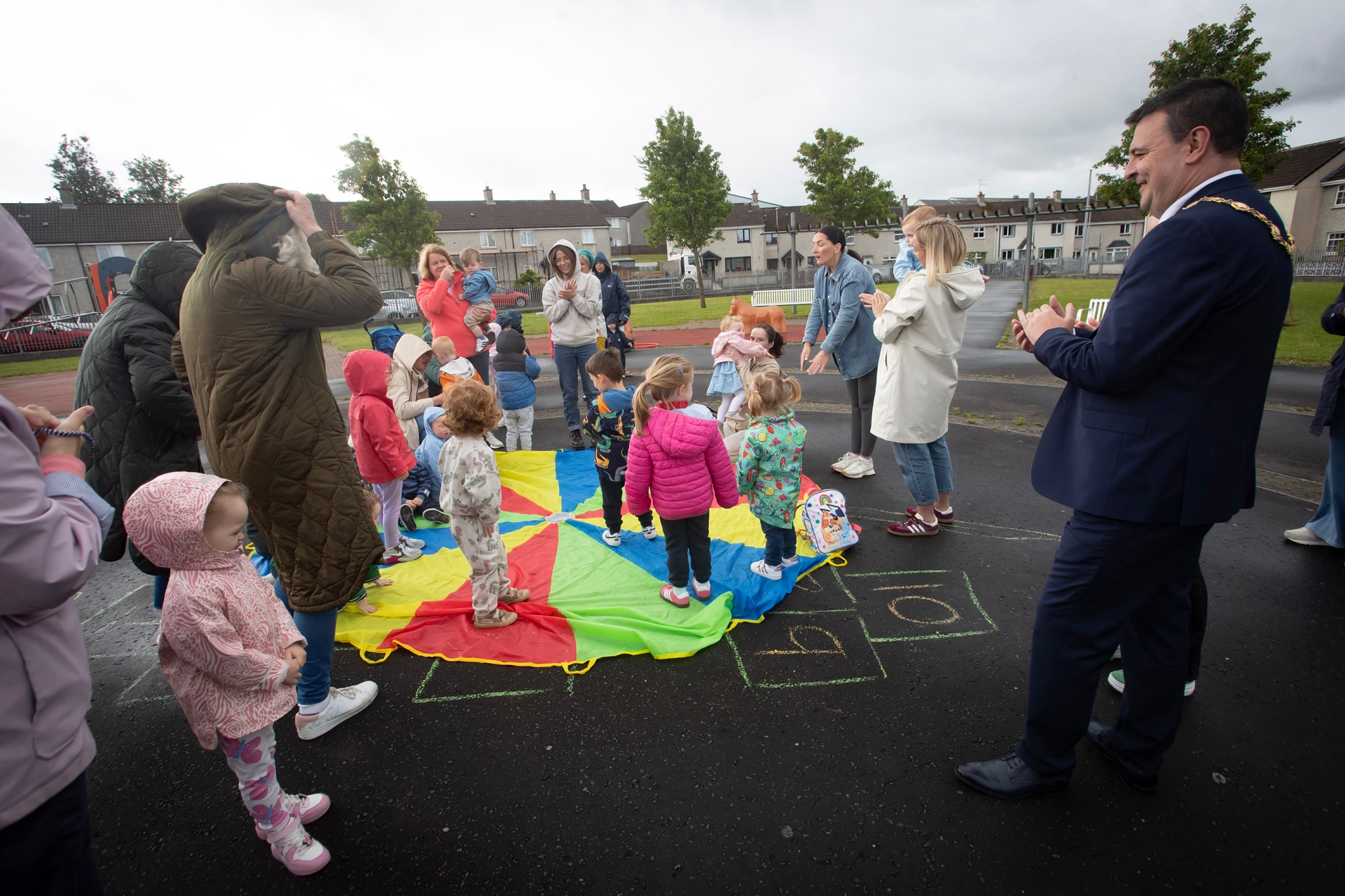The Mayor, Ruairi McHugh joining in the fun on Thursday at Clooney.