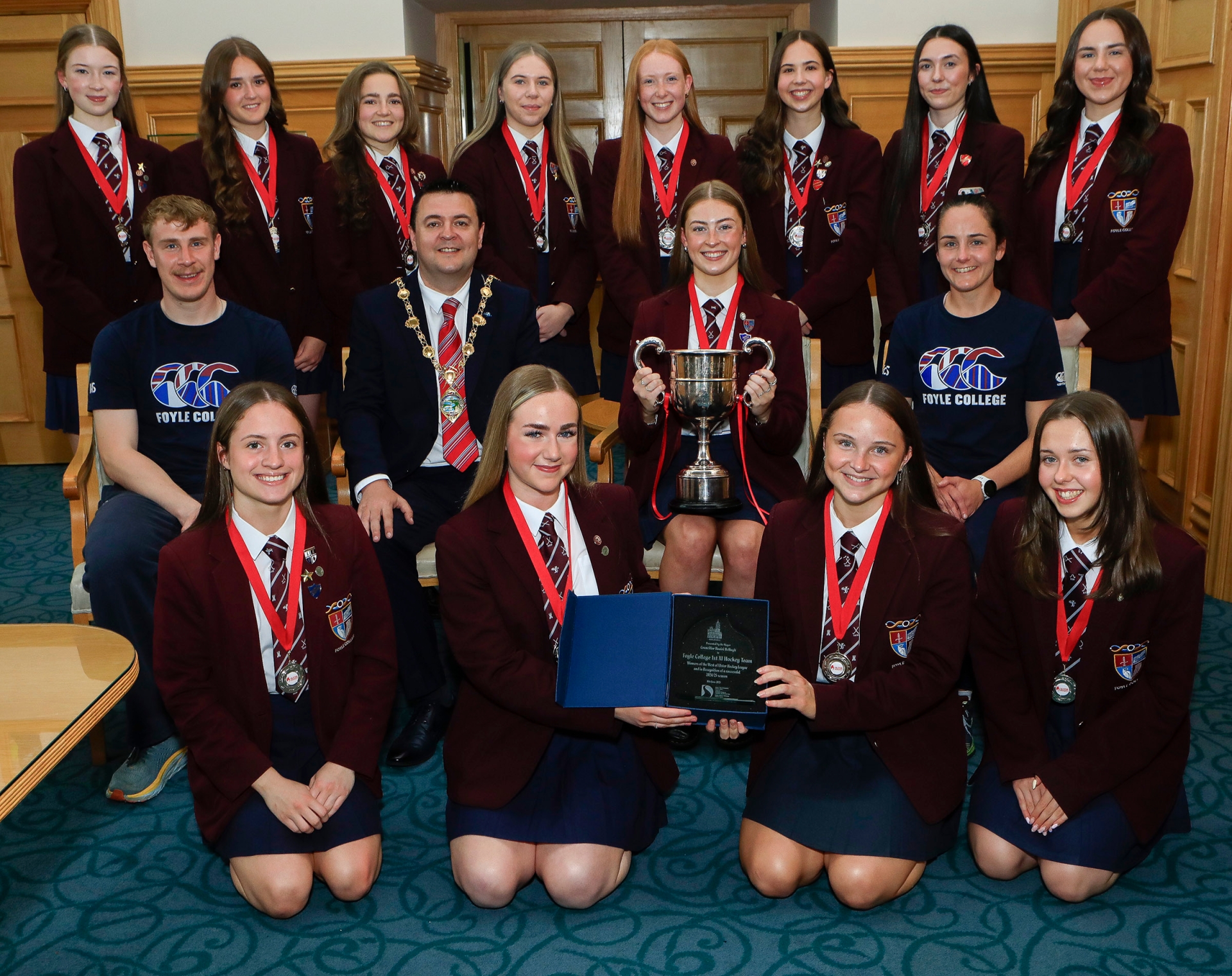 Mayor Ruairí McHugh at a reception held in the Mayor's Parlour, to celebrate the success of Foyle College 1st XI hockey team during the 2024/25 season. This team finished as runners up in the Ulster Hockey Stevenson Bowl in December. They have also won the West of Ulster Hockey League for the first time. Seated on left, is Matthew Steele (coach), and from right, Rachael McSparron (coach) and Rosie McHugh, team captain. (Photos - Tom Heaney, nwpresspics)