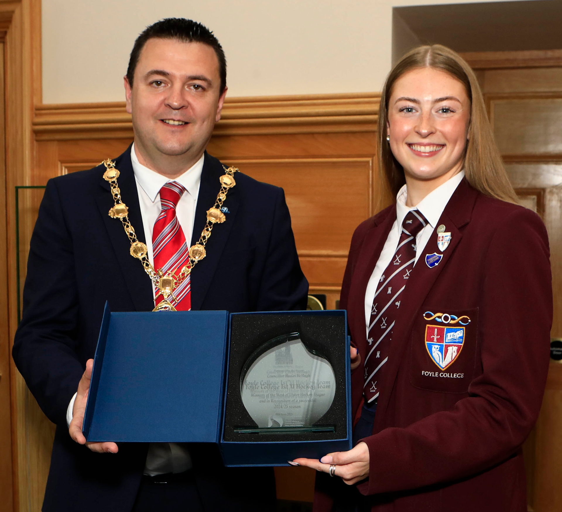 Mayor Ruairí McHugh presents commemorative crystal to Rosie McHugh, captain at a reception held in the Mayor's Parlour, to celebrate the success of Foyle College 1st XI hockey team during the 2024/25 season. This team finished as runners up in the Ulster Hockey Stevenson Bowl in December. They have also won the West of Ulster Hockey League for the first time.