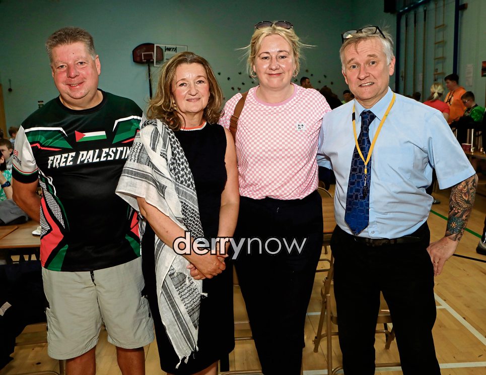Group pictured at the Coffee Morning, “Olive Branch for Gaza”, and end of sponsored fast St. Joseph’s Boys’ School. From left, are Colr. Conor Heaney, Annemarie Meehan, Mary Durkan and Gerry McBride. (Photos - Tom Heaney, nwpresspics)