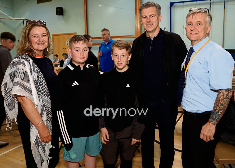 Colr. Shaun Harkin with from left, Annemarie Meehan, Corey McDevitt, James McKinney and Gerry McBride at the Coffee Morning, “Olive Branch for Gaza”, and end of sponsored fast St. Joseph’s Boys’ School. (Photos - Tom Heaney, nwpresspics)