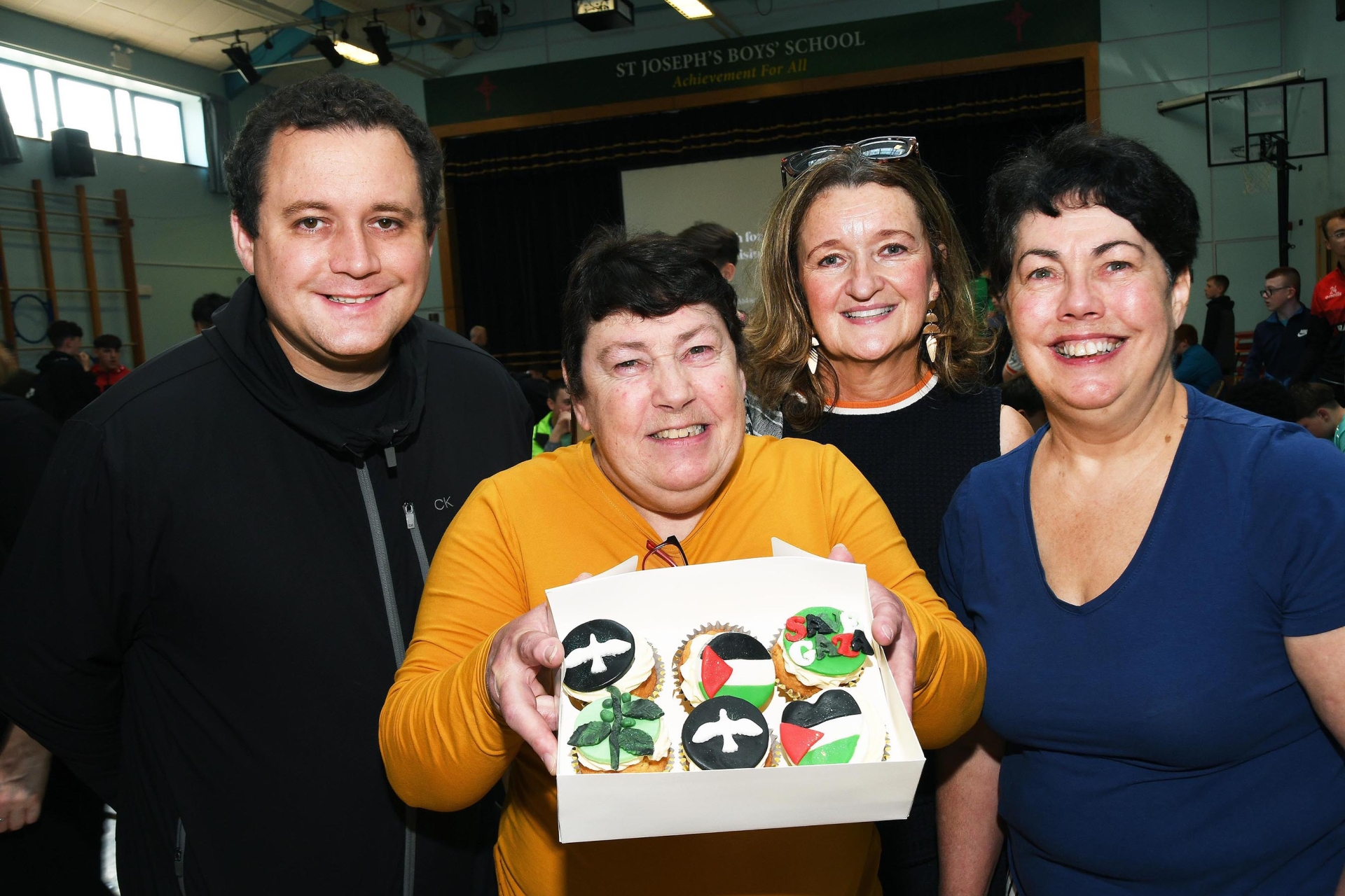Tina Duffy baked Palestinian-themed buns with the help of baker Theresa Brogan which were sold at the Olive Branch For Gaza Coffee Morning held in St. Joseph's Boys' School to raise funds for water and medical aid. Included are Kevin Meehan, Annmarie Meehan, event organiser, and Martarita Duffy.