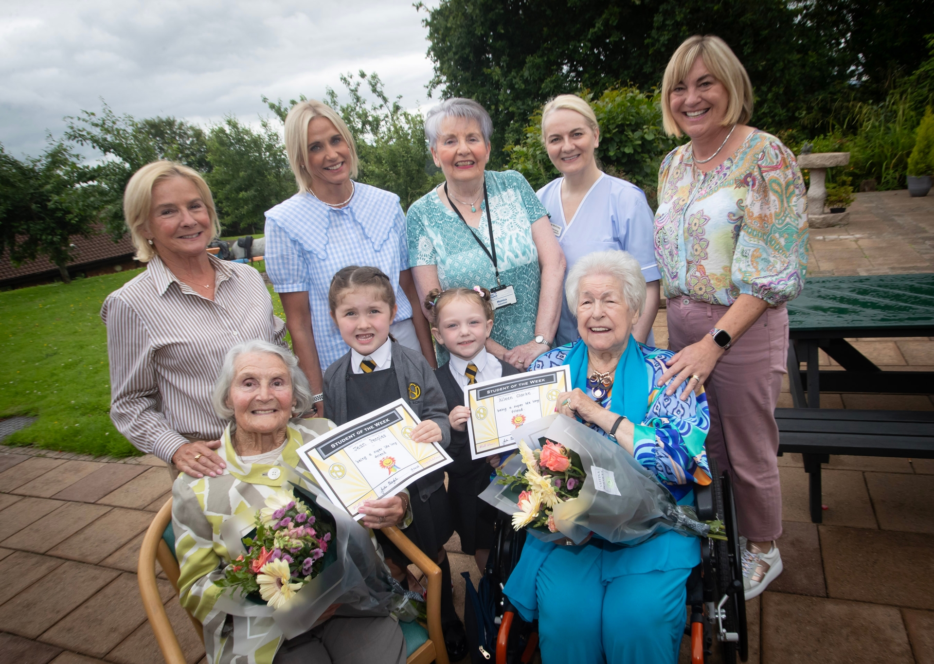 Primary 1 pupils Penny and Grace present Jean and Aileen with their 'Student of the Week' certificates during their visit.