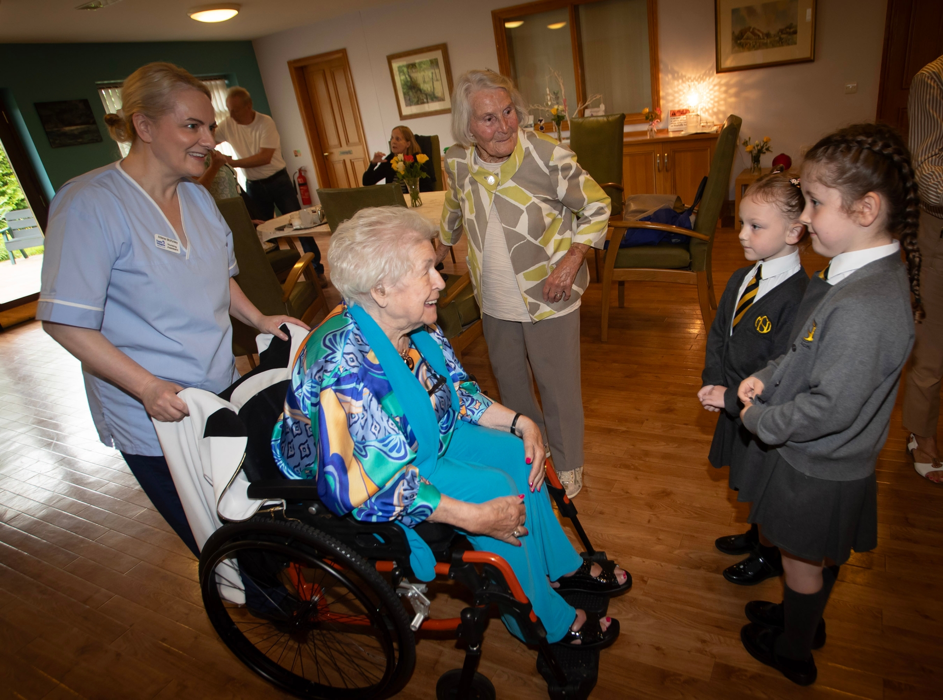 The two young P1 pupils telling Jean and Aileen how the Model Primary School has changed since their days.