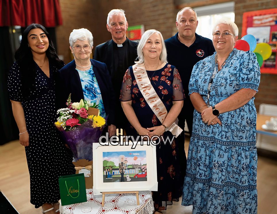 Mary Bachata, principal, Chapel Road PS pictured at her retirement after 35 years (school principal for nine). Included from left, are Kala Bachata (daughter), Mary McLaughlin (mother), Fr Michael Canny, PP, Mark McLaughlin, chairperson, Board of Governors, and Ann McCallion (staff). (Photos - Tom Heaney, nwpresspics)