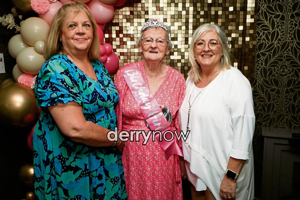 Bernadette Bradley celebrates her 80th birthday at Waterfoot Hotel with on left, Carol Mailey and on right, Sharon McLaughlin.