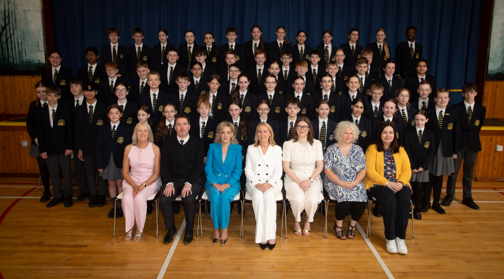 Year 8 students who achieved Gold Merit Awards with Mrs Ailish O’Kane (Head of Year 10), Mrs Léan McShane (Senior Teacher), Mrs Brónach O’Hare (Vice Principal), Mrs Roisin McDermott (Head of Year 8) and Year 8 Form Tutors.