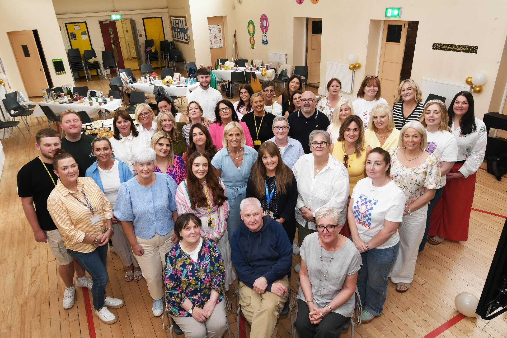 Retirees (seated) Una McCool, 32 years service, Rory Morrisson, 27 years, and Susan Devenney, 23 years, pictured with staff at the Model Primary School. (Photos: Keith Moore/Jim McCafferty Photography)
