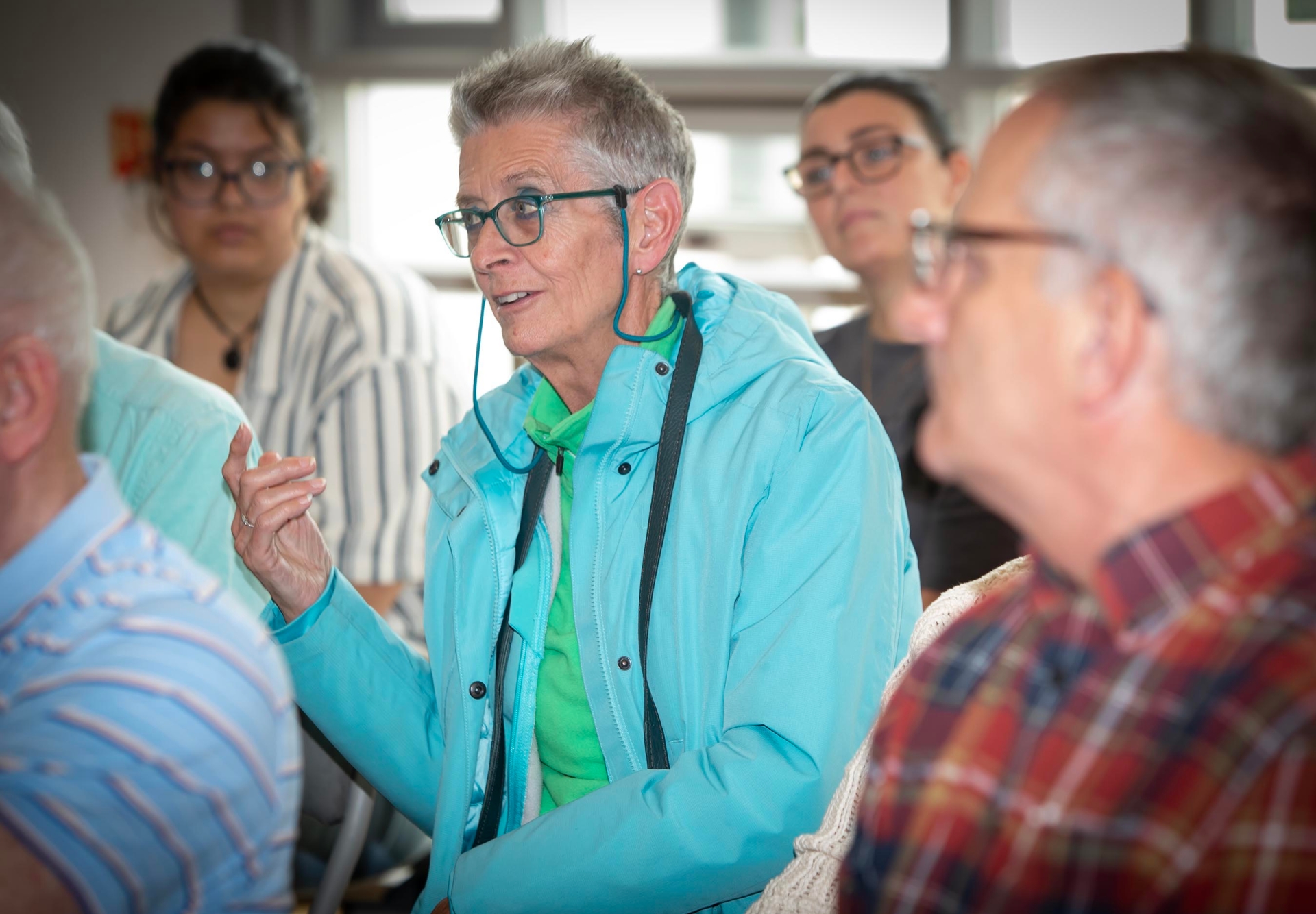 A member of the audience makes a point about bonfires during the 'Mythbusting' event.