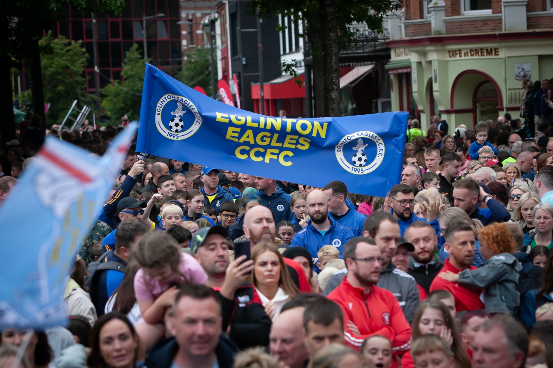 Eglinton Eagles banner proudly held aloft on Monday in Guildhall Square, Derry.