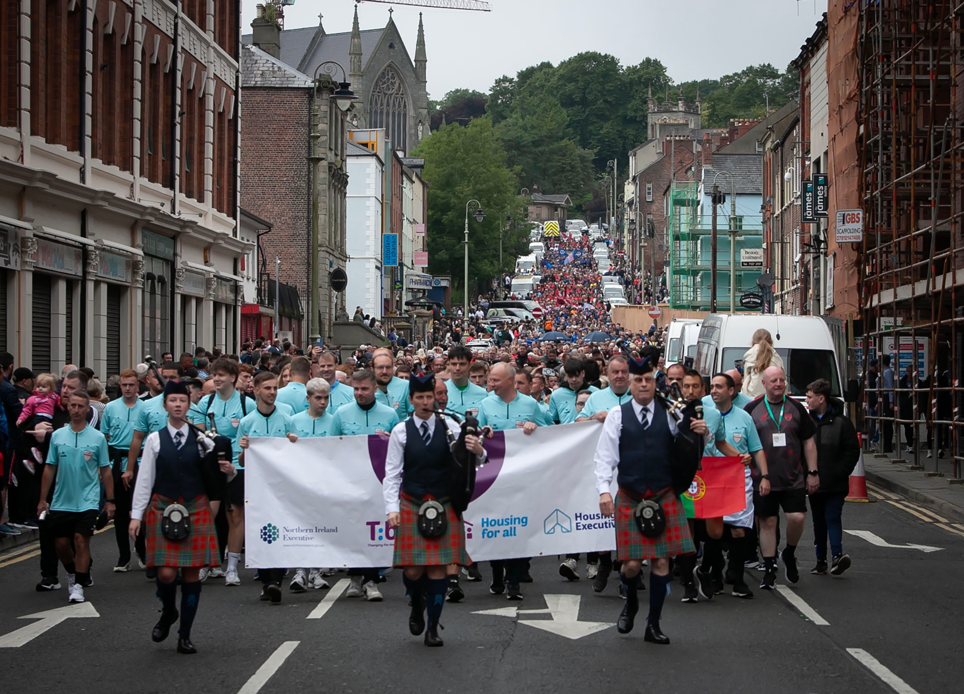 The 2025 Foyle Cup parade makes its way towards the city centre on Monday.