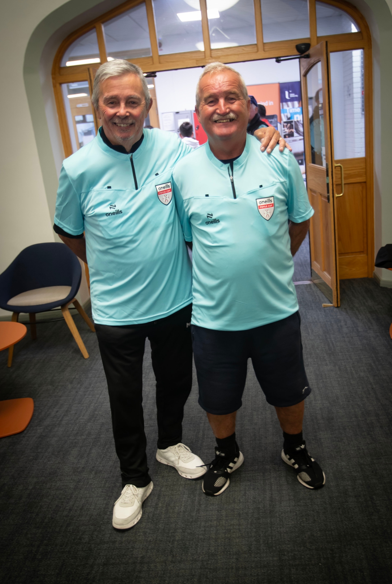 Two of Derry's veteran referees who are making a comeback for this year's Foyle Cup - Charlie Kelpie and Martin Dunne, pictured at Ulster University Magee on Monday.