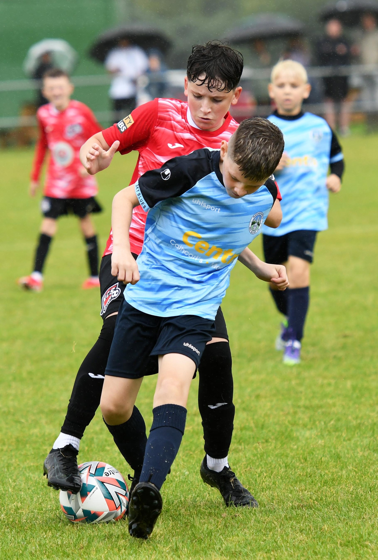 Magherafelt SB Jets defender Odhran O'Boyle holds off Maiden City Colts under-11's player Dean McIntyre.
