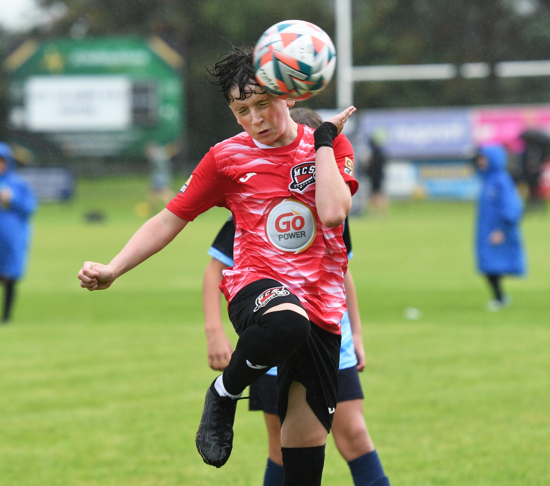 Dean McIntyre scores for Maiden City Colts with this header during their under-11's match against Magherafelt SB Jets.