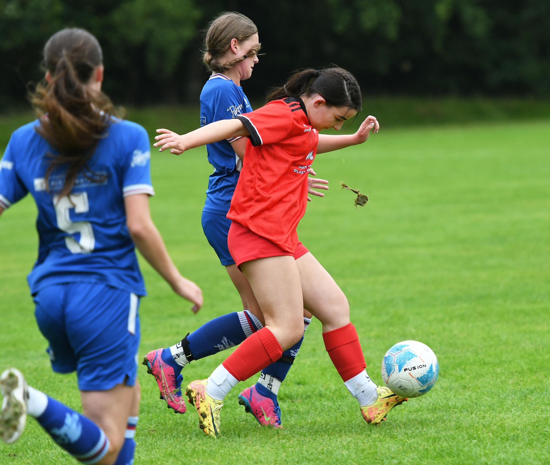 Culdaff Girls under-15's player Chloe McDaid holds off a Loughgall Lakers midfielder at St. Columb's Park. (Photos: Keith Moore)