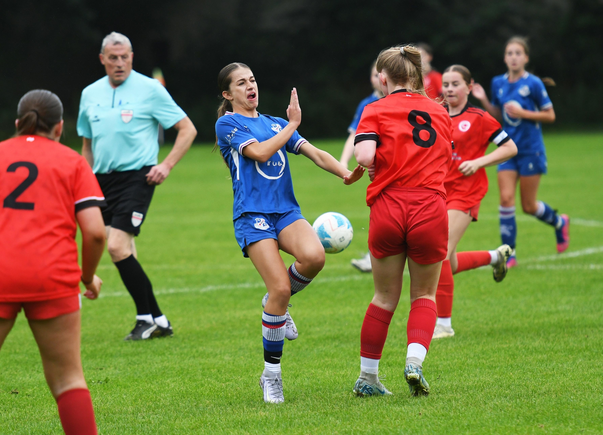 Annabelle Boyce, Loughgall Lakers, and Emma Ruddy, Culdaff Girls under-15's, clash in midfield at St. Columb's Park.