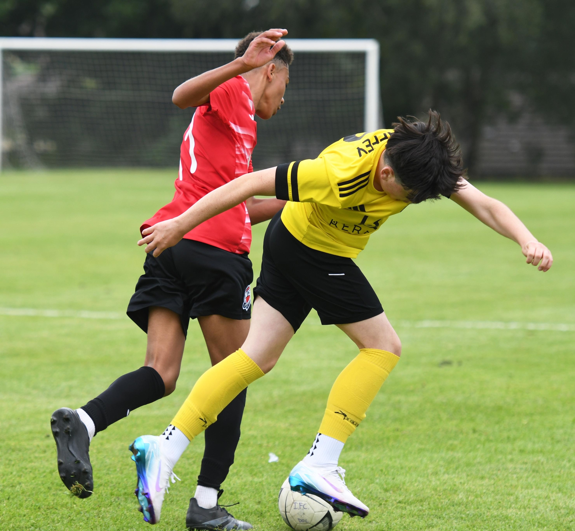 Cruz Smith, Maiden City Academy under-14's tussles with Illistrin player Harry Gaffey.