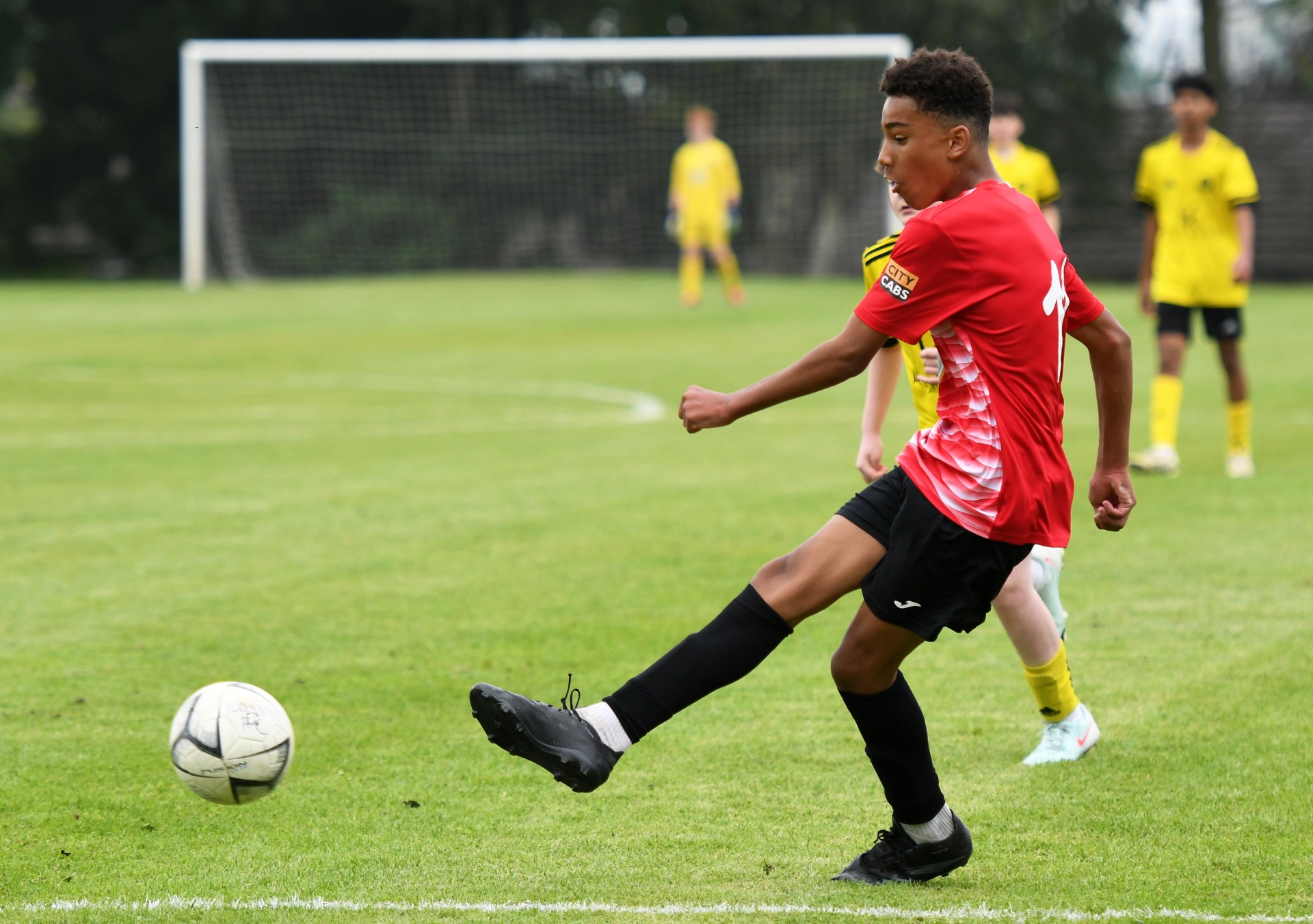 Cruz Smith, Maiden City Academy under-14's, tries a shot at goal.