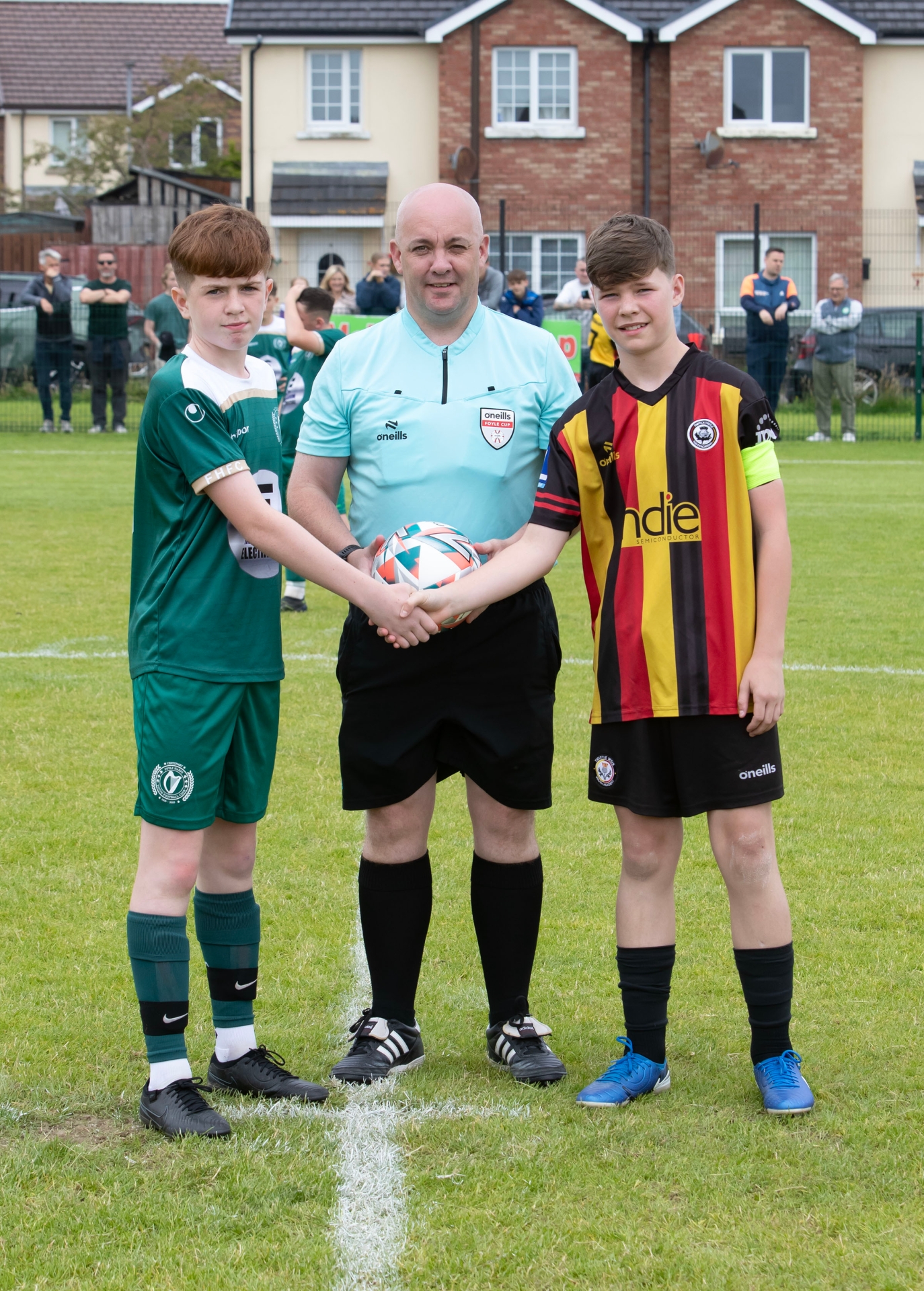 Referee alongside club captains for Partick and Foyle Harps u-13 prior to their quarter final Foyle Cup encounter.