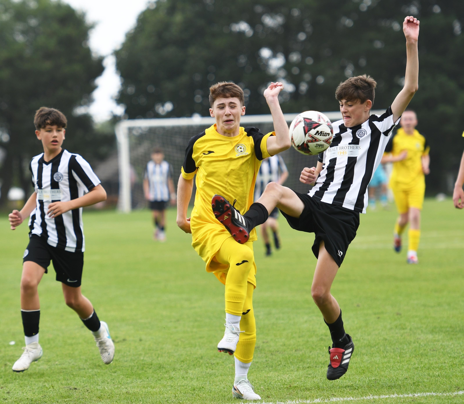 Rohan Mallin, Blantyne Soccer Academy, and Aidan Halbrook, St. Oliver Plunkett, battle for the ball.