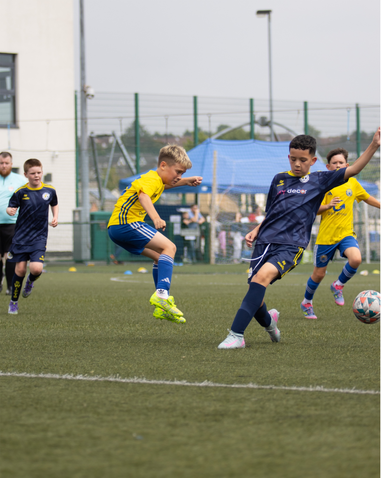 One player takes to the air as a sliding tackle comes in during Thursday’s Foyle Cup Under 10’s group game between Moyola Park AFC and Sion Swifts FC.